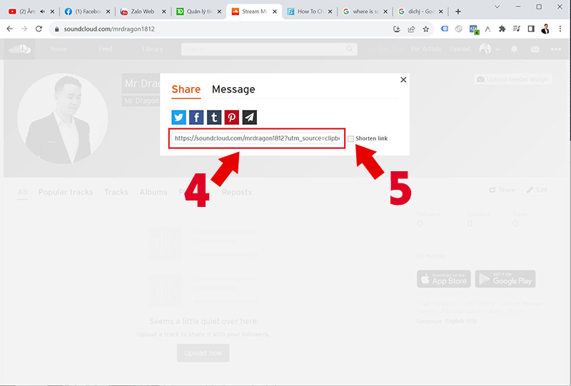 Now you see your Soundcloud profile url (4). But if you want to shorten it, select Shorten link (5).